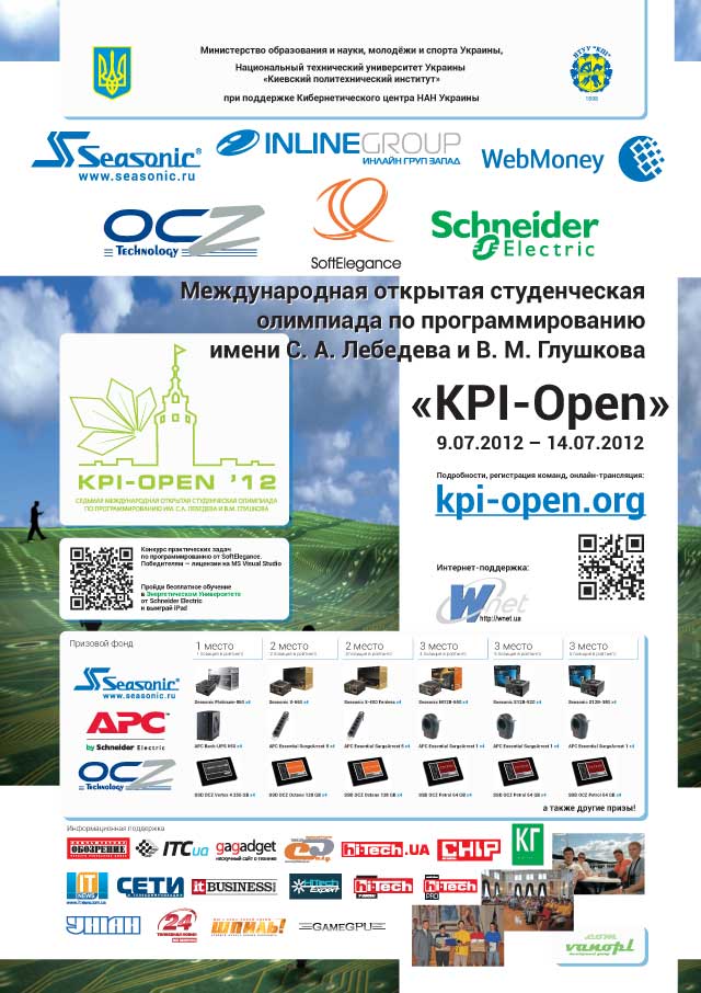 10 июля 2012г. состоялось открытие 7 Международной студенческой олимпиады по программированию "KPI-OPEN", посвященой С.А. Лебедеву и В.М. Глушкову. Олимпиада проходит в НТУУ "КПИ": http://www.kpi-open.org/. К началу олимпиады было зарегистрировано -