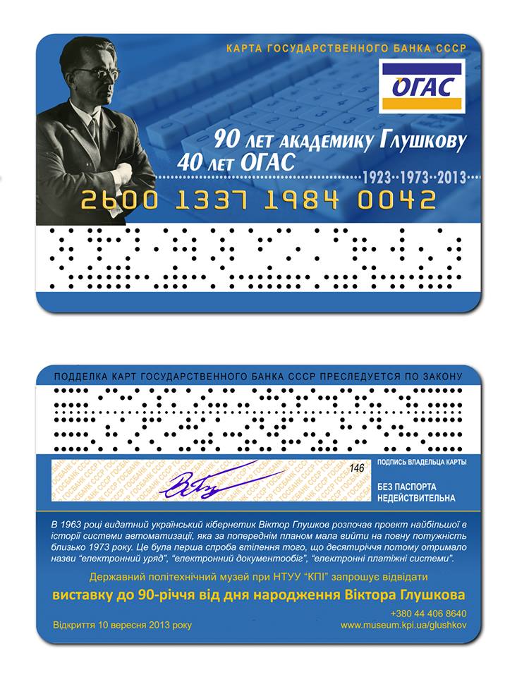 К 90-летнему юбилею академика Виктора Михайловича Глушкова –выдающегося украинского математика и кибернетика, основателя Института кибернетики АН Украины, выпустили пластиковую сувенирную карточку VISA. Как рассказали IT Expert в Государственном политехническом музее при НТУУ «КПИ» – это была их инициатива.